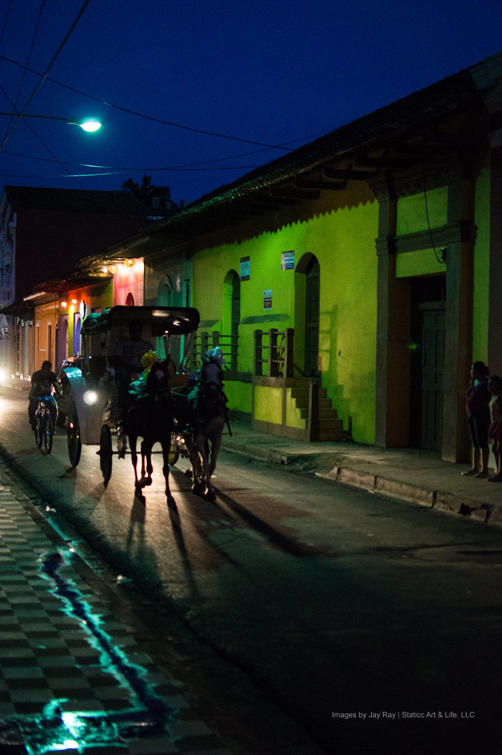 As night fell, my clients returned, and we sat and cracked the gifts of Nicaraguan rum that were provided with friends and family, before walking to get food and visit their other friends who were in town. As we prepared to walk I was able to see the same thing I’d seen by day, but beautiful night images of a small city not ready to go to sleep yet. The building colors accented the dark streets like a rainbow, and the people of the town were ready to chat and enjoy the night.